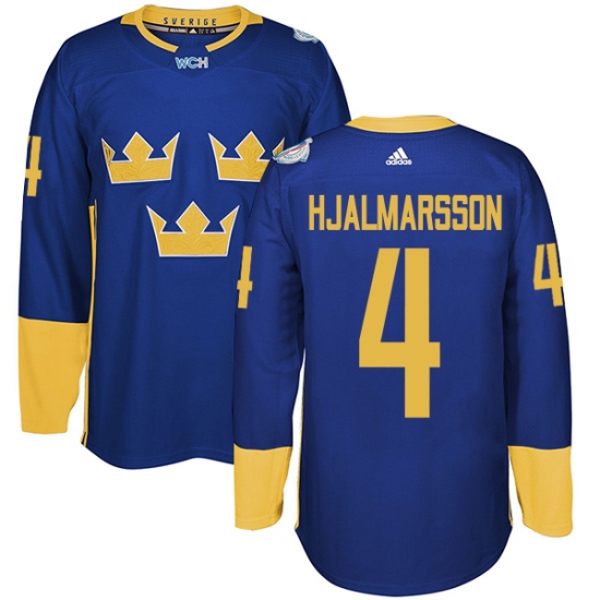 Men's Adidas Team Sweden #4 Niklas Hjalmarsson Premier Royal Blue Away 2016 World Cup of Hockey Jersey