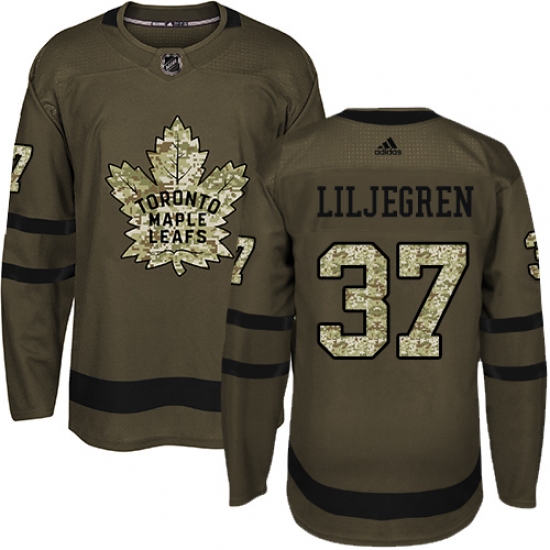 >Men's Adidas Toronto Maple Leafs #37 Timothy Liljegren Authentic Green Salute to Service NHL Jersey