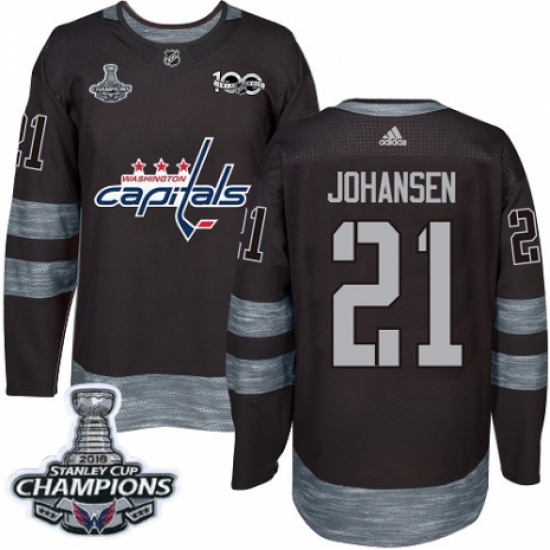 >Men's Adidas Washington Capitals #21 Lucas Johansen Authentic Black 1917-2017 100th Anniversary 2018 Stanley Cup Final Champions NHL Jersey