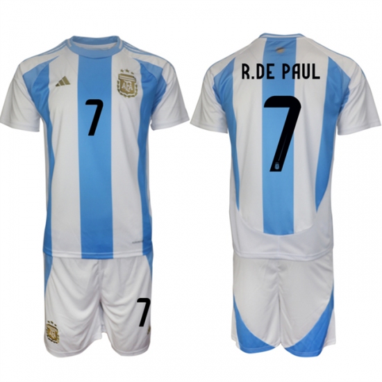 >Men's Argentina #7 Rodrigo Javier De Paul White Blue 2024-25 Home Soccer Jersey Suit