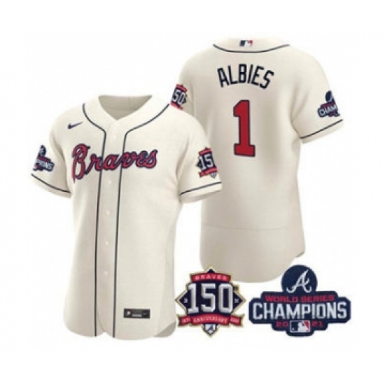 Men's Atlanta Braves #1 Ozzie Albies 2021 Cream World Series Champions With 150th Anniversary Flex Base Stitched Jersey