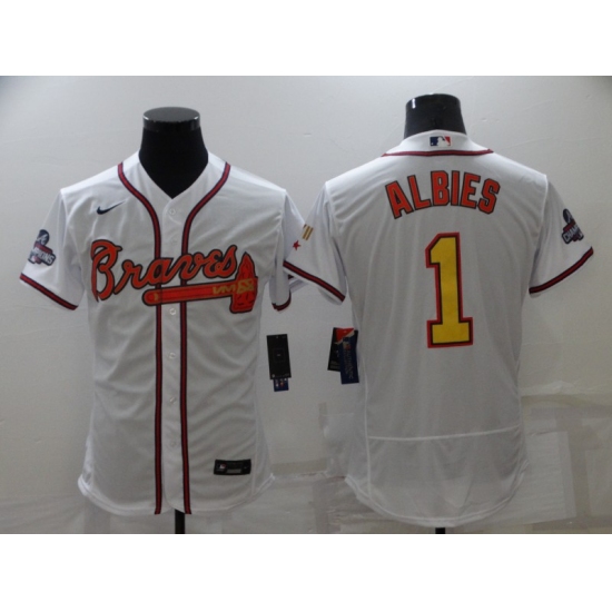 Men's Atlanta Braves #1 Ozzie Albies 2021 White Gold World Series Champions Jersey