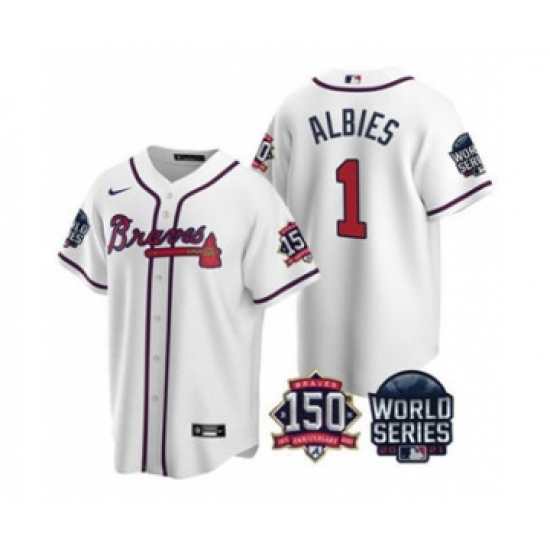 Men's Atlanta Braves #1 Ozzie Albies 2021 White World Series With 150th Anniversary Patch Cool Base Baseball Jersey