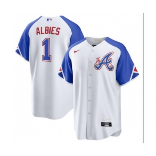 Men's Atlanta Braves #1 Ozzie Albies White 2023 City Connect Cool Base Stitched Baseball Jersey