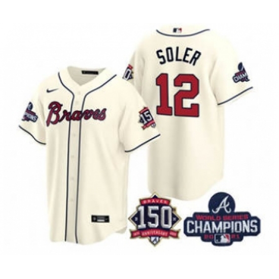 >Men's Atlanta Braves #12 Jorge Soler 2021 Cream World Series Champions With 150th Anniversary Patch Cool Base Stitched Jersey