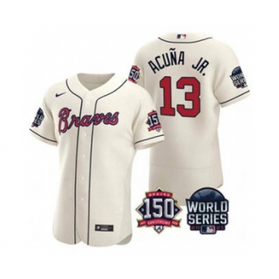 Men's Atlanta Braves #13 Ronald Acuna Jr. 2021 Cream World Series Flex Base With 150th Anniversary Patch Baseball Jersey
