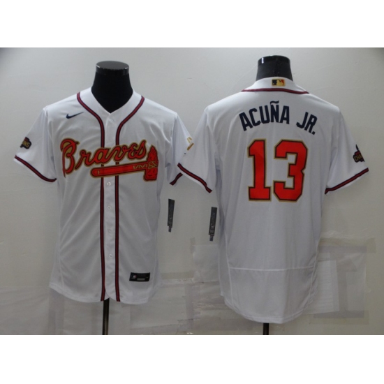 Men's Atlanta Braves #13 Ronald Acuna Jr. 2021 White Gold World Series Champions Jersey