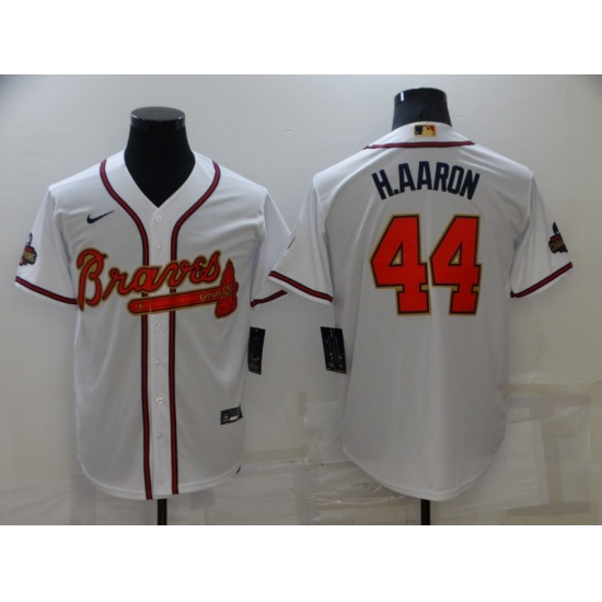 >Men's Atlanta Braves #44 Hank Aaron Nike White 2022 Gold Program Authentic Player Jersey
