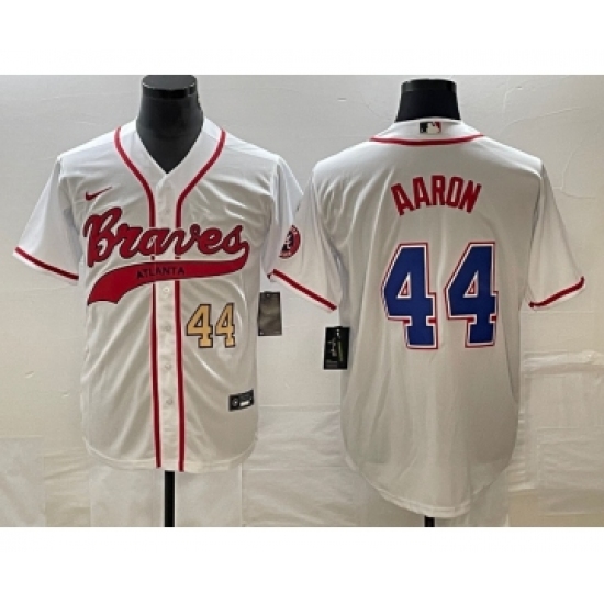 >Men's Atlanta Braves #44 Hank Aaron Number White Cool Base Stitched Baseball Jersey