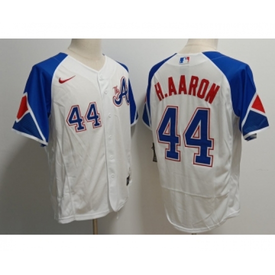 >Men's Atlanta Braves #44 Hank Aaron White 2023 City Connect Flex Base Stitched Baseball Jersey