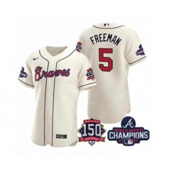 Men's Atlanta Braves #5 Freddie Freeman 2021 Cream World Series Champions With 150th Anniversary Flex Base Stitched Jersey