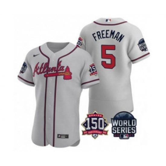 Men's Atlanta Braves #5 Freddie Freeman 2021 Gray World Series Flex Base With 150th Anniversary Patch Baseball Jersey