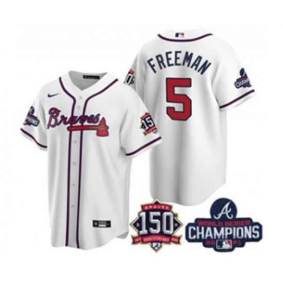 Men's Atlanta Braves #5 Freddie Freeman 2021 White World Series Champions With 150th Anniversary Patch Cool Base Stitched Jersey