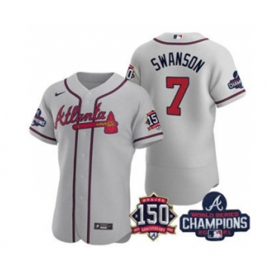 Men's Atlanta Braves #7 Dansby Swanson 2021 Gray World Series Champions With 150th Anniversary Flex Base Stitched Jersey