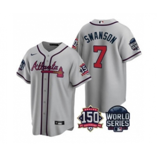 Men's Atlanta Braves #7 Dansby Swanson 2021 Gray World Series With 150th Anniversary Patch Cool Base Baseball Jersey