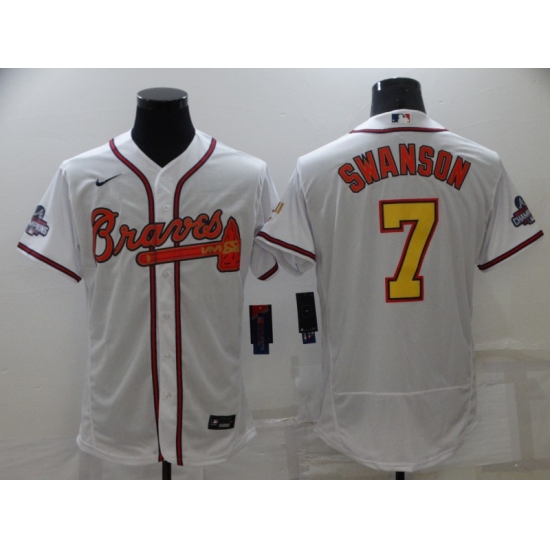 Men's Atlanta Braves #7 Dansby Swanson 2021 White Gold World Series Champions Jersey
