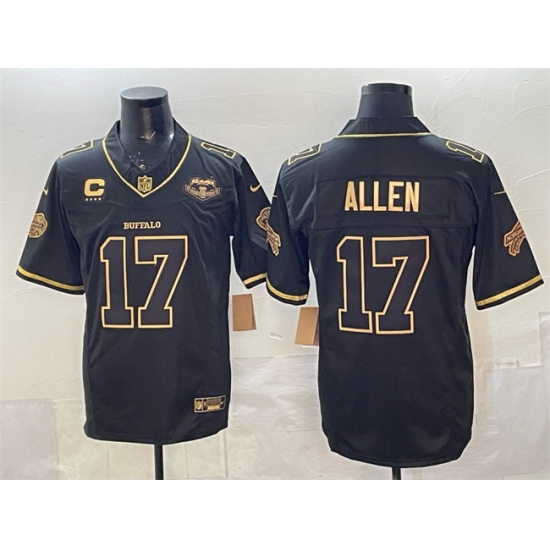 >Men's Buffalo Bills #17 Josh Allen Black Gold 2025 F.U.S.E. “Rivalries” With Farewell & 4-Star C Vapor Limited Football Stitched Jersey