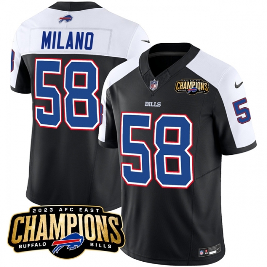 >Men's Buffalo Bills #58 Matt Milano Black White 2023 F.U.S.E. AFC East Champions With 4-star C Football Stitched Jersey