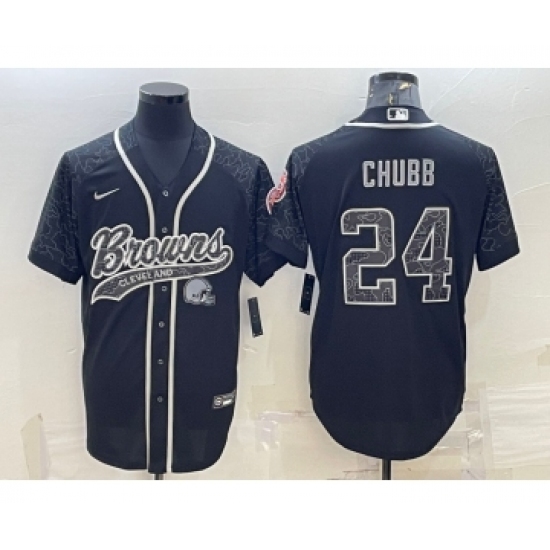 >Men's Cleveland Browns #24 Nick Chubb Black Reflective With Patch Cool Base Stitched Baseball Jersey