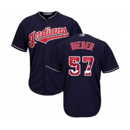 Men's Cleveland Indians #57 Shane Bieber Authentic Navy Blue Team Logo Fashion Cool Base Baseball Jersey