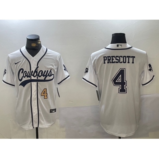 >Men's Dallas Cowboys #4 Dak Prescott White With Navy Name Cool Base Stitched Baseball Jerseys