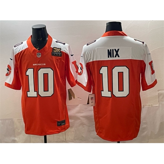 >Men's Denver Broncos #10 Bo Nix Orange 2024 F.U.S.E. With 3-Time Champions Throwback Vapor Limited Alternate Football Stitched Jersey