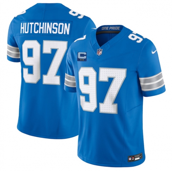 >Men's Detroit Lions #97 Aidan Hutchinson Blue 2025 F.U.S.E. With 2-Star C Vapor Limited Football Stitched Game Jersey