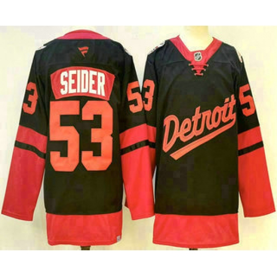 >Men's Detroit Red Wings #53 Moritz Seider Black 2025 Stadium Series Stitched Jersey
