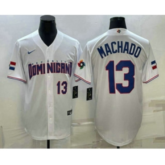 >Mens Dominican Republic Baseball #13 Manny Machado Number 2023 White World Baseball Classic Stitched Jersey