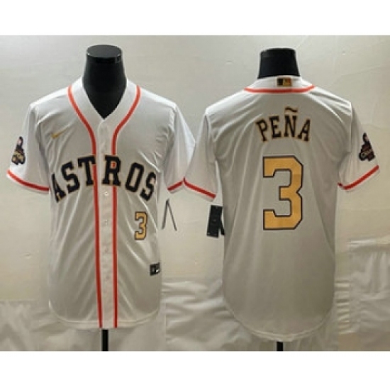 >Men's Houston Astros #3 Jeremy Pena 2023 White Gold World Serise Champions Cool Base Stitched Jersey1