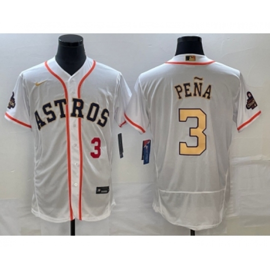 >Men's Houston Astros #3 Jeremy Pena Number 2023 White Gold World Serise Champions Flex Base Stitched Jersey2