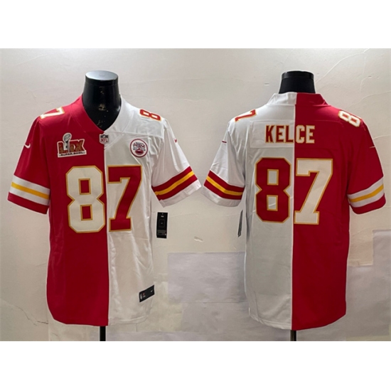 Men's Kansas City Chiefs #87 Travis Kelce Red & White Split 2025 Super Bowl LIX Vapor Limited Stitched Football Jersey
