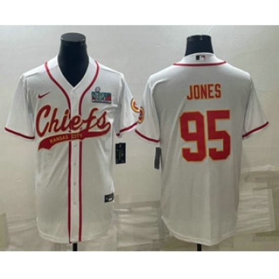 >Men's Kansas City Chiefs #95 Chris Jones White With Super Bowl LVII Patch Cool Base Stitched Baseball Jersey