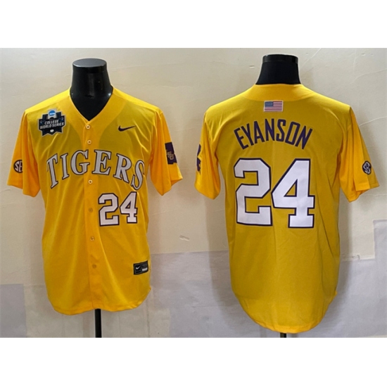 >Men's LSU Tigers #24 Anthony Eyanson Gold 2025 World Series & SEC Patch Stitched Baseball Jersey