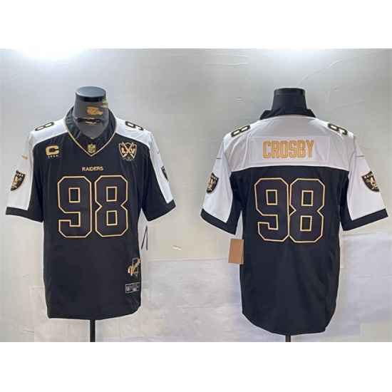 >Men's Las Vegas Raiders #98 Maxx Crosby Black Gold F.U.S.E. With Nevada Silver Stat Patch And 65th Anniversary 4-Star C Limited Stitched Football Jersey