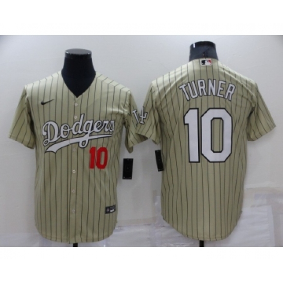 Men's Los Angeles Dodgers #10 Justin Turner Cream Pinstripe Stitched MLB Cool Base Nike Jersey