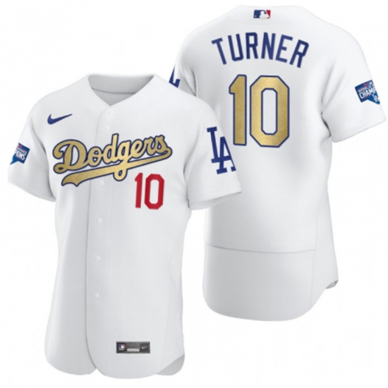 >Men's Los Angeles Dodgers #10 Justin Turner Olive Gold 2020 World Series Champions Authentic Jersey