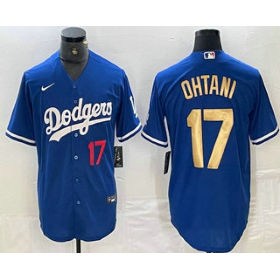 Men's Los Angeles Dodgers #17 Shohei Ohtani Number Blue Gold Stitched Cool Base Nike Jerseys