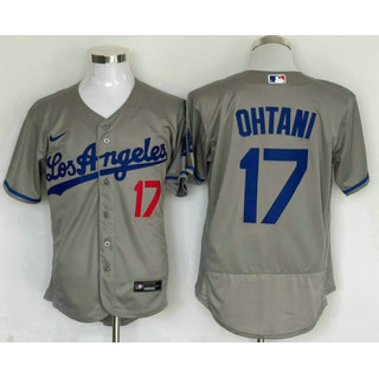 >Men's Los Angeles Dodgers #17 Shohei Ohtani Number Grey With Los Stitched Flex Base Nike Jersey