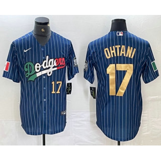 Men's Los Angeles Dodgers #17 Shohei Ohtani Number Mexico Blue Gold Pinstripe Cool Base Stitched Jersey