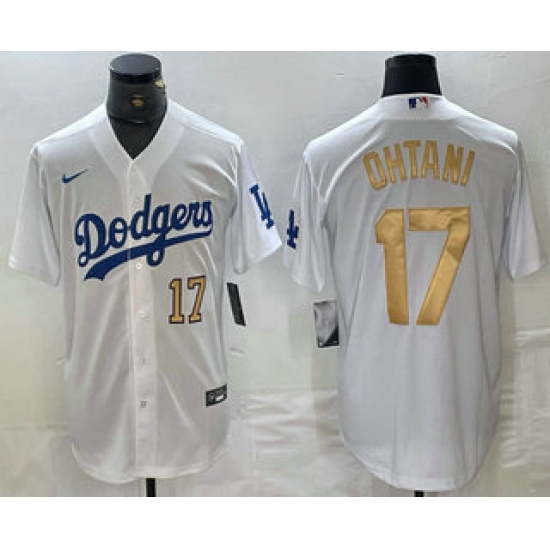 >Men's Los Angeles Dodgers #17 Shohei Ohtani Number White Gold Stitched Cool Base Nike Jerseys