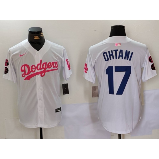 >Men's Los Angeles Dodgers #17 Shohei Ohtani White Pink Vin & Kobe Stitched Baseball Jersey