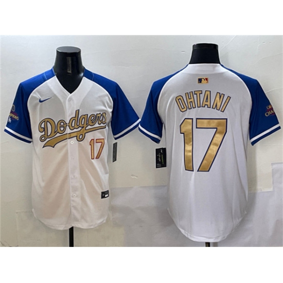 Men's Los Angeles Dodgers #17 Shohei Ohtani White Royal Gold 2024 World Series Champions Vapor Limited Stitched Baseball Jersey