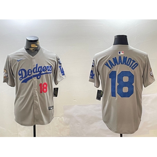 Men's Los Angeles Dodgers #18 Yoshinobu Yamamoto Grey 2024 World Series With Fernando Memorial Limited Stitched Baseball Jersey