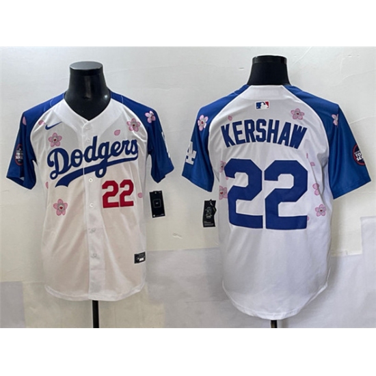 >Men's Los Angeles Dodgers #22 Clayton Kershaw White Royal 2025 Tokyo Series Limited Stitched Baseball Jersey