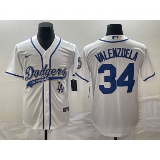 >Men's Los Angeles Dodgers #34 Fernando Valenzuela White Cool Base Stitched Baseball Jersey