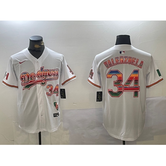 >Men's Los Angeles Dodgers #34 Fernando Valenzuela White Rainbow Mexico Cool Base Stitched Fashion Jersey