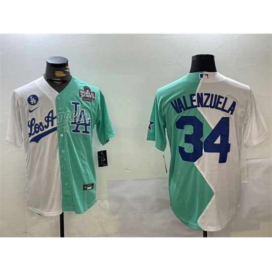>Men's Los Angeles Dodgers #34 Toro Valenzuela White Green Split 2024 World Series All-Star Cool Base Stitched Baseball Jersey