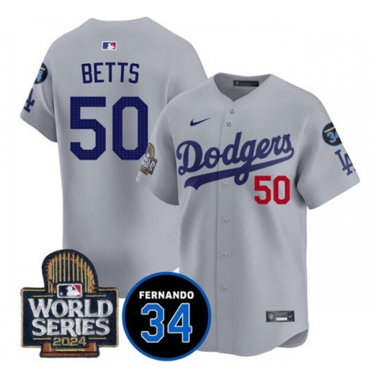 Men's Los Angeles Dodgers #50 Mookie Betts Grey 2024 World Series With Fernando Memorial Limited Stitched Baseball Jersey