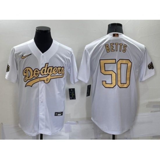 >Men's Los Angeles Dodgers #50 Mookie Betts White 2022 All Star Stitched Cool Base Nike Jersey